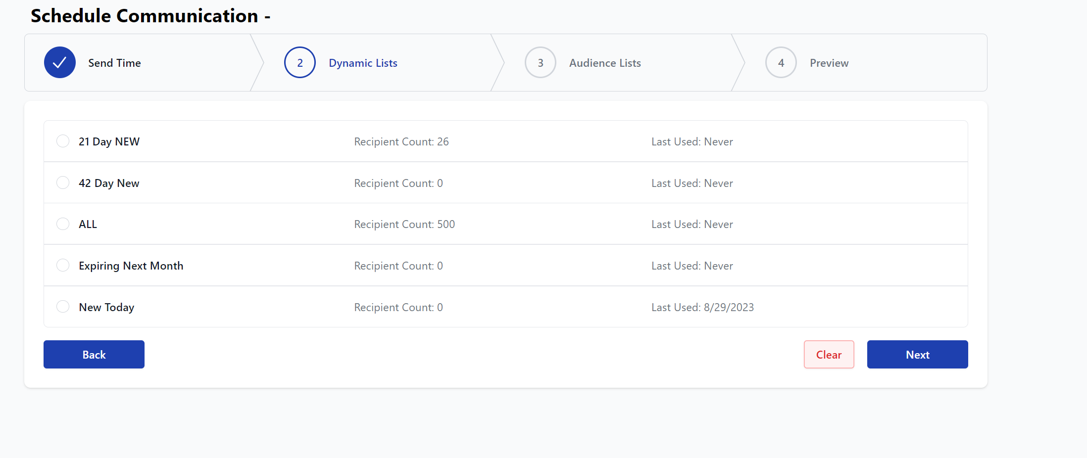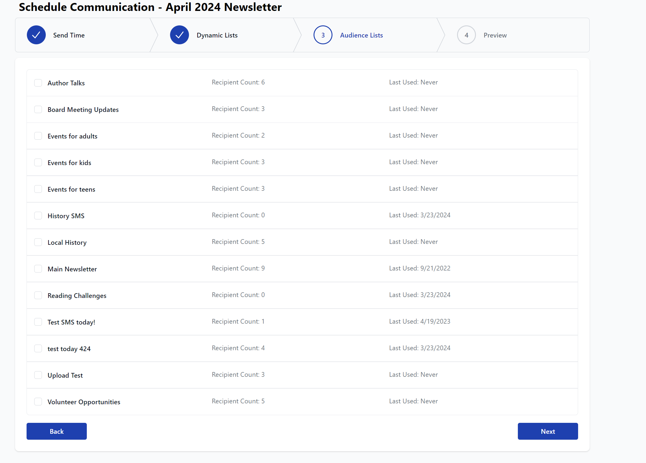 - Next, you will be asked to select audience lists you wish to include in the communications. When you are ready to continue, select "Next".