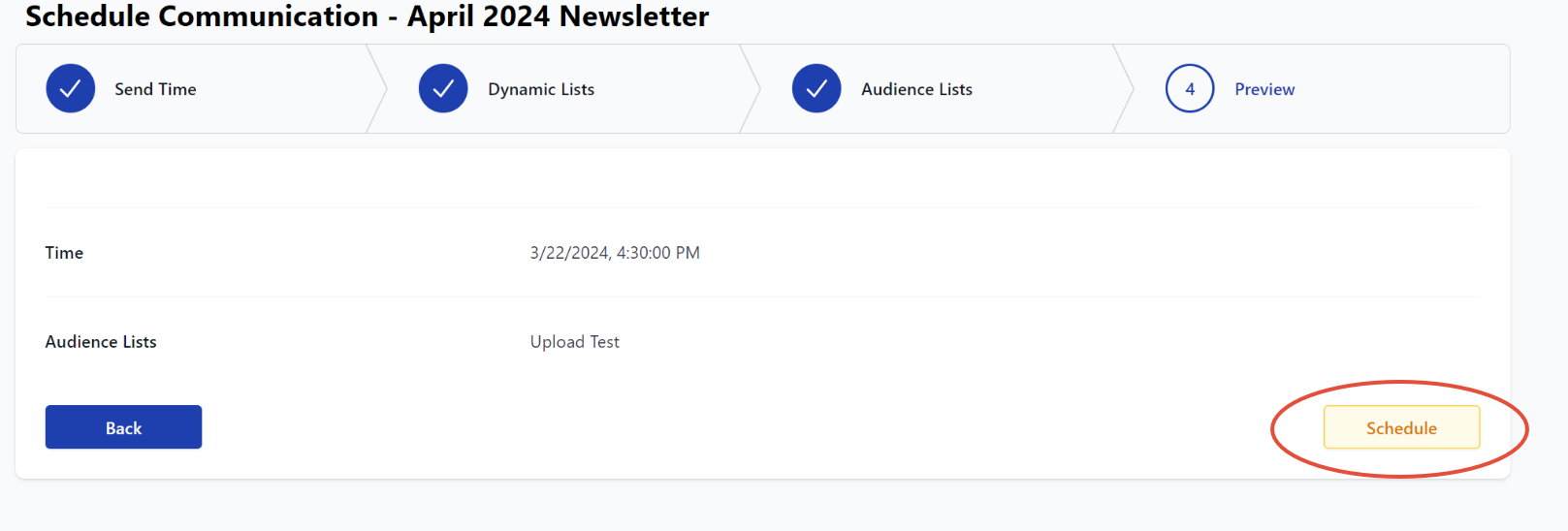 - You will then be presented with an option to review and confirm the date, time and selected lists. Once you are ready to send or schedule the message, select the "schedule" button.
