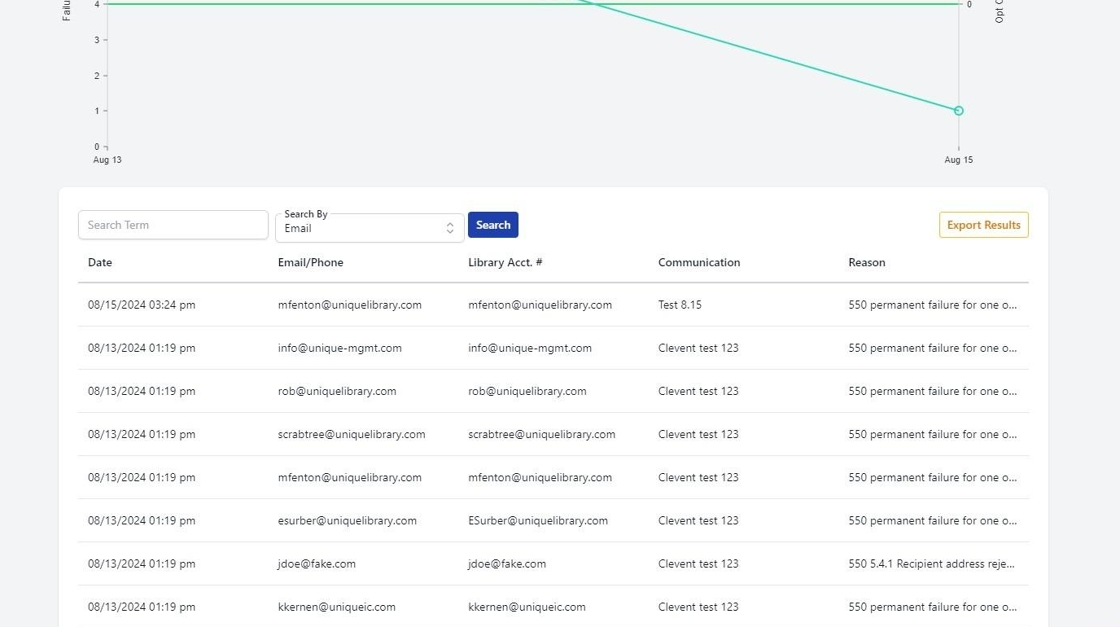 9. You will see a list of the failed sends with date, email/phone, library account number, communication and reason for failure. This can be exported into a spreadsheet by selecting "Export Results".