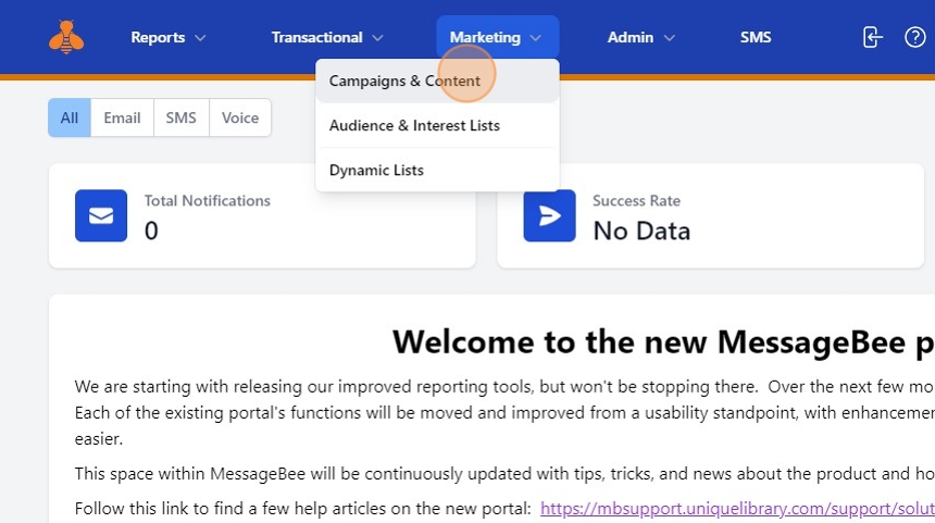 2. Next you will want to select your desired piece of content to edit. To do so, Click "Campaigns & Content" and edit your desired communication.