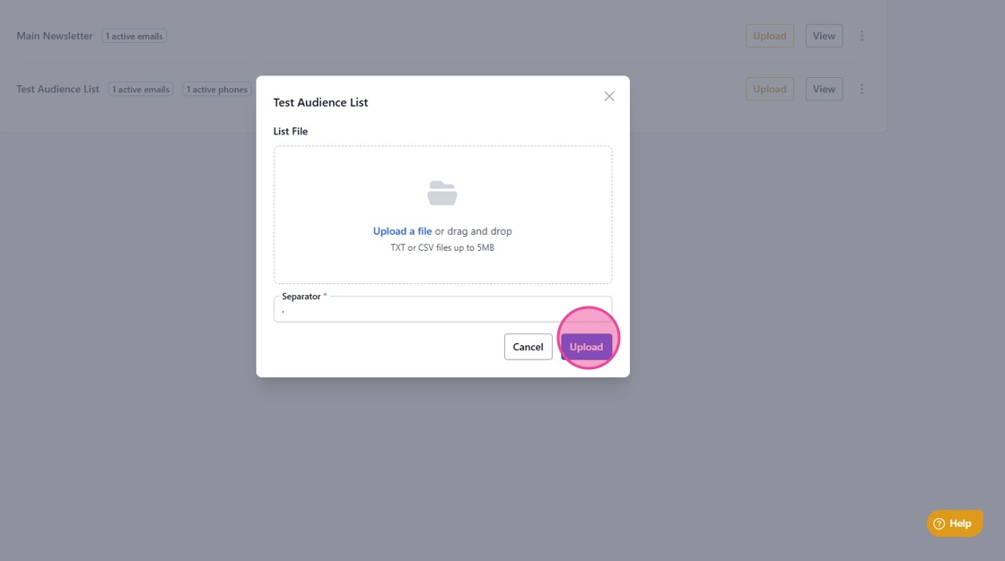 8. Drag and drop your file (please use TXT or CSV files) into the designated area, then click “Upload” to add the contacts to your list.