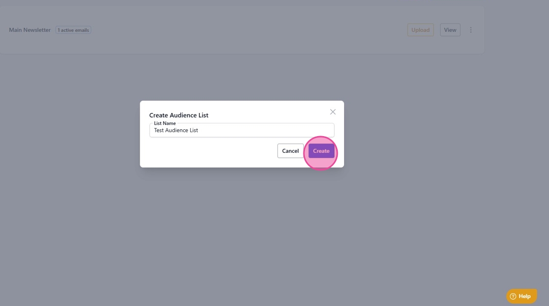 4. Name your list and click “Create” to finalize it. In the sample below we have named the list "Test Audience List".