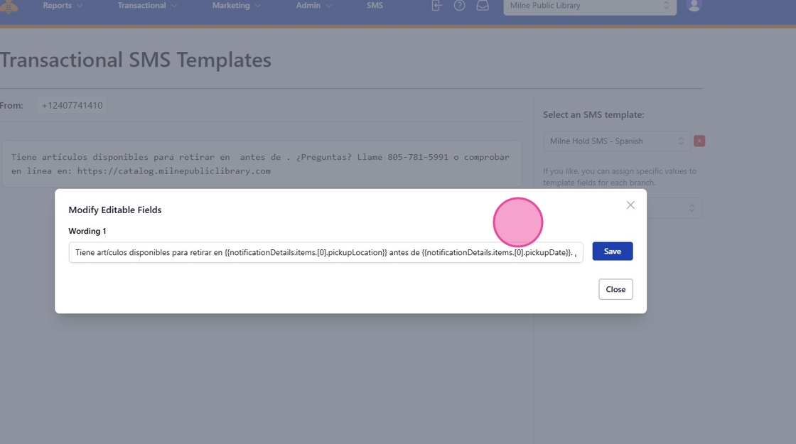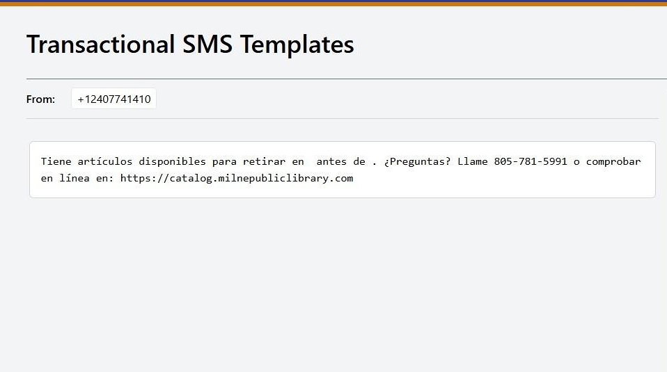 4. To the right you will "Select an SMS template". This will allow you to slect the desired communication you would like to review and/or edit. You will select a Type (Hold, Overdue, etc.) and then the specific Communication (Hold pickup, hold reminder, etc.).