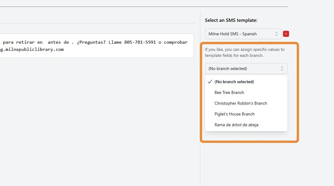 6. If you manage multiple locations and are set up for branch overrides, you can choose a specific branch from the drop-down menu to tailor the message for that location. Please note - not all will have this option.