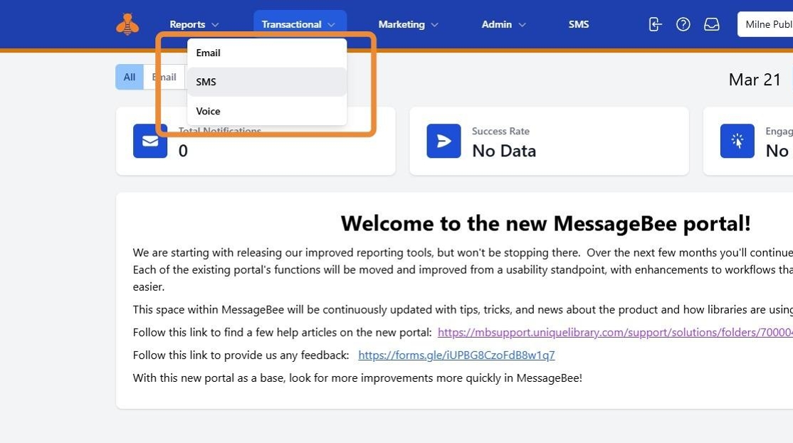 1. To view your transactional (circulation notification) templates in MessageBee, navigate to the Transactional tab.
