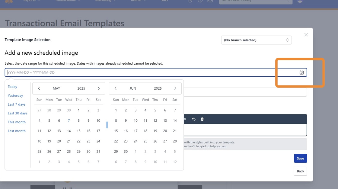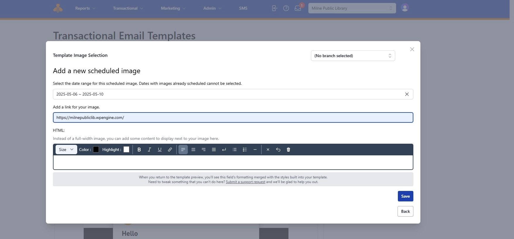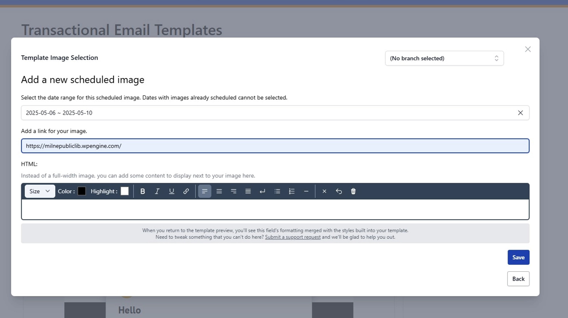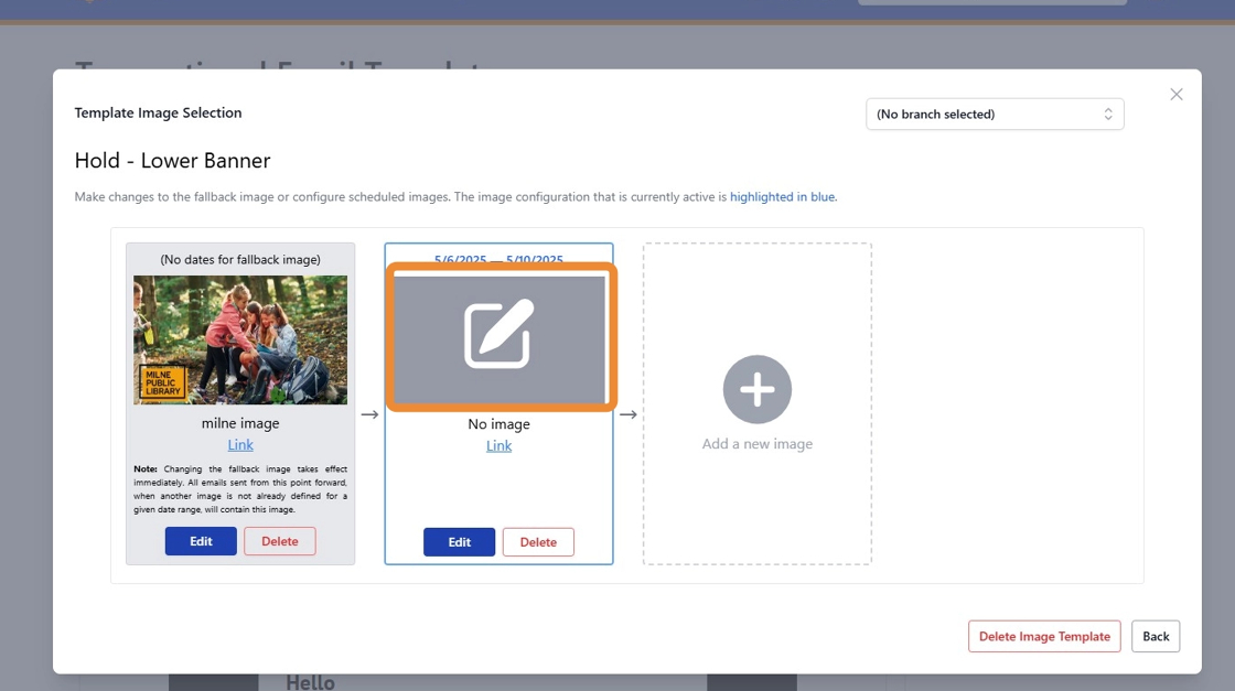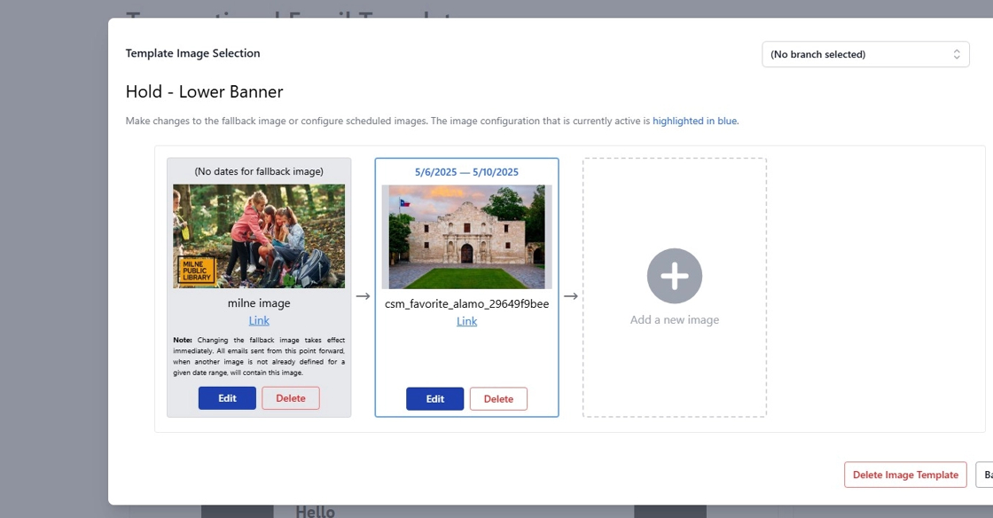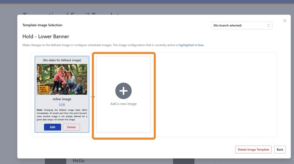 1. If your transactional template(s) uses a specific image or "banner", you can customize it from the "Image Selection" button.