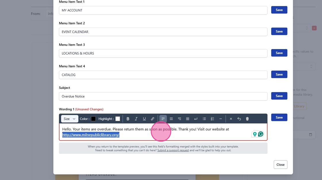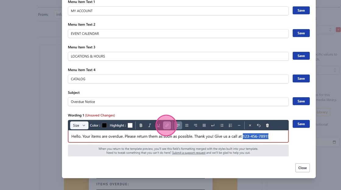 This guide provide steps for adding hyperlinks for direct contact within the body text of transactional notifications.
