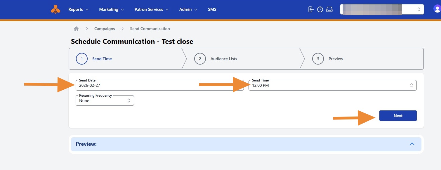 10. You will then step through the "Schedule Communication" steps. First, select the desired delivery date and time. Then click Next.