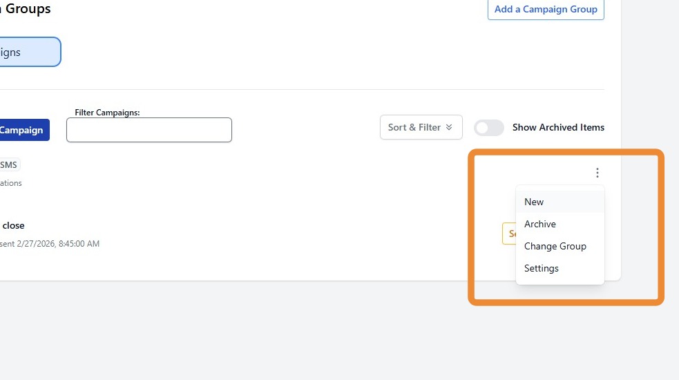 5. To create a new message, locate your desired campaign. Click the three-dot menu next to your campaign title. Select New.