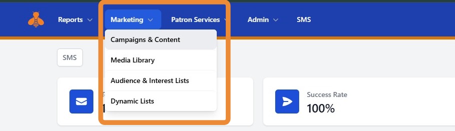 1. First, you will want to create a Campaign. From the portal home page, navigate to the Marketing drop down menu and select Campaigns and Content.